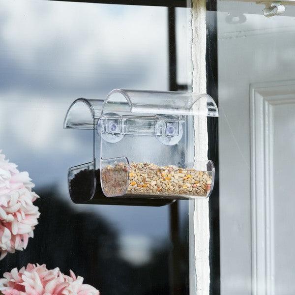 Walter Harrisons window feeder. Perfect for watching birds up close. Crystal clear design. Easy to fill and clean. 2 suction window mounts. Size: 14cm x 13xm x 11cm