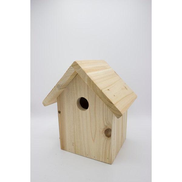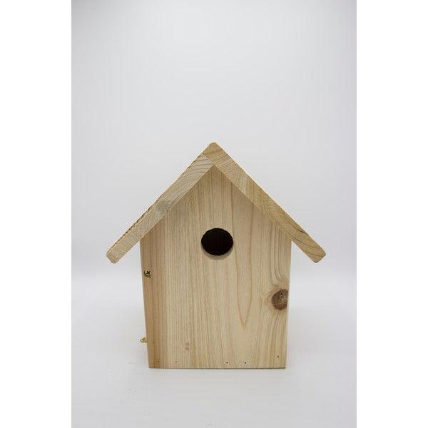Walter Harrisons apex roof nest box made from 15mm gauge Fir. 32mm diameter hole in the front panel. The left hand side of the box includes a panel which can be opened and used for viewing. The roof overhangs the front of the box, providing protection against the elements and predators at the entrance hole. A separate plinth is included which can be screwed to the back of the nest box (3 screws included) and which can be used to fix the box to a tree. Finished with a clear and safe preservative. 31 x 21 x 18cm