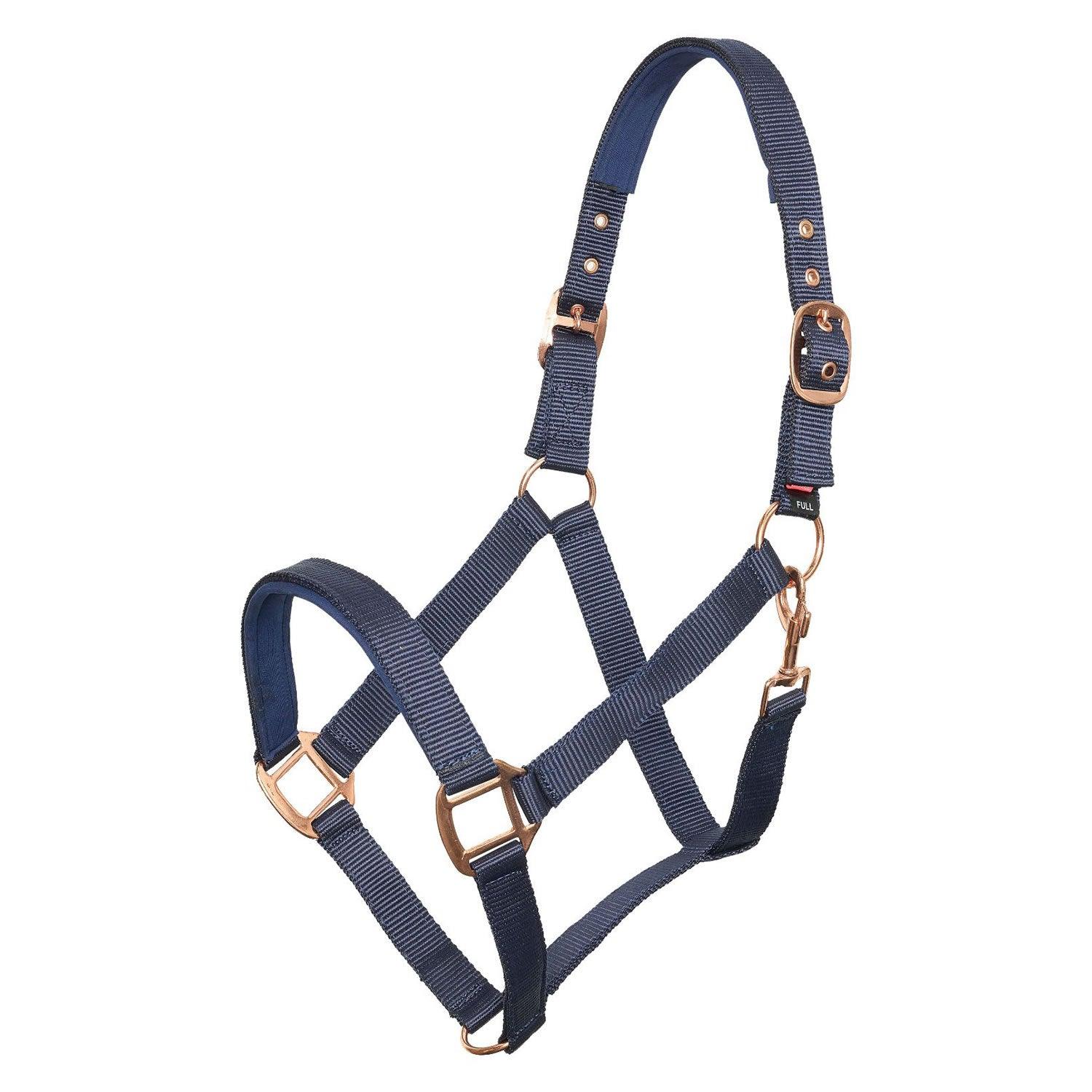 Beautiful nylon, soft neoprene padded halter. The halter is softly padded under the headpiece and noseband. The halter has a luxurious look due to the metal colors rose gold and gold. The halter is adjustable on both sides and the throatlash has a snap closure.