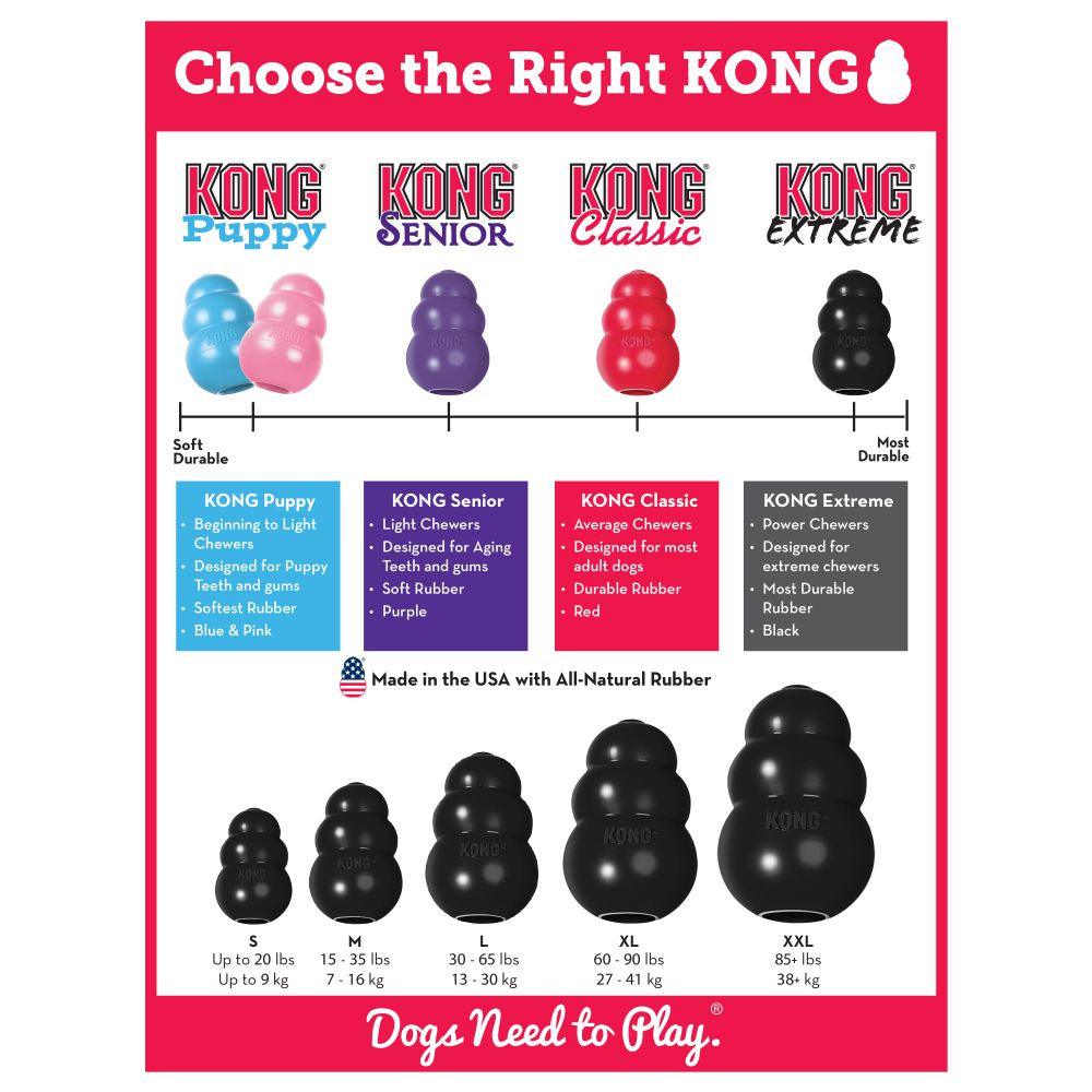 The KONG Extreme dog toy represents the most durable strength of KONG rubber. Designed for the toughest of chewers, the KONG Extreme offers enrichment and helps satisfy dogs' instinctual needs. The KONG unique, ultra-durable, all-natural rubber formula is designed for determined chewers, while the erratic bounce fulfils a dog's need to play. Want to extend play time? Be sure to stuff with tempting bits of kibble and entice with a dash of peanut butter. Add to the fun by adding KONG Snacks and top with KONG Easy Treat. Stuff and Freeze for a longer-lasting challenge.