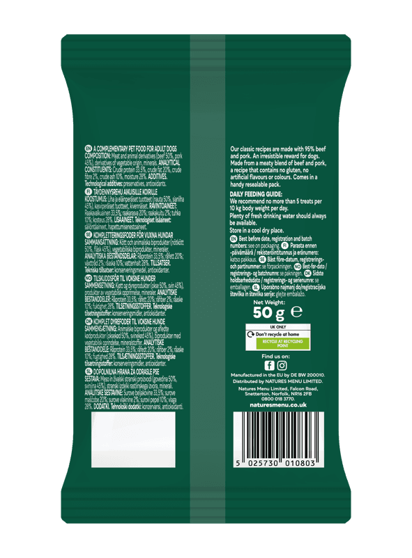 Bursting with the savoury flavour of high-content meat protein, our classic beef treat is made with 95% beef and pork. No gluten. Pack size 50g.