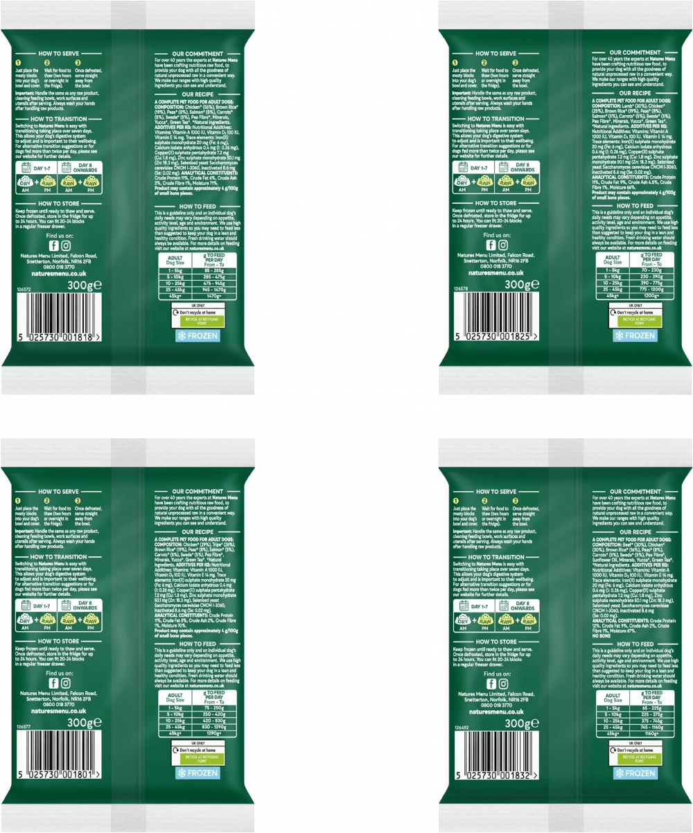 These complete and nutritionally balanced 60 40 dog food blocks are served in convenient 300g portions. Simply thaw and serve. Easy to store in your freezer and super practical for dogs whose meals average at 300g, 600g or 900g each day.