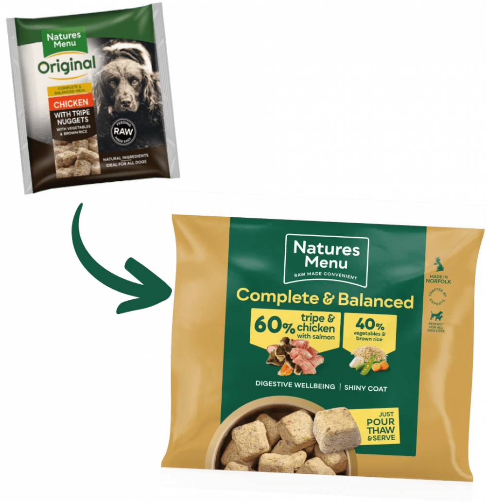 Chicken and tripe dog food in raw nugget form is a simple and convenient way to feed your four-legged friend, as you need simply pour the number of nuggets your dog needs, let them thaw then serve. Mess-free meal times and licked clean bowls. Your dog will thank you for the shiny coats and happy digestion that natural feeding can lead to.