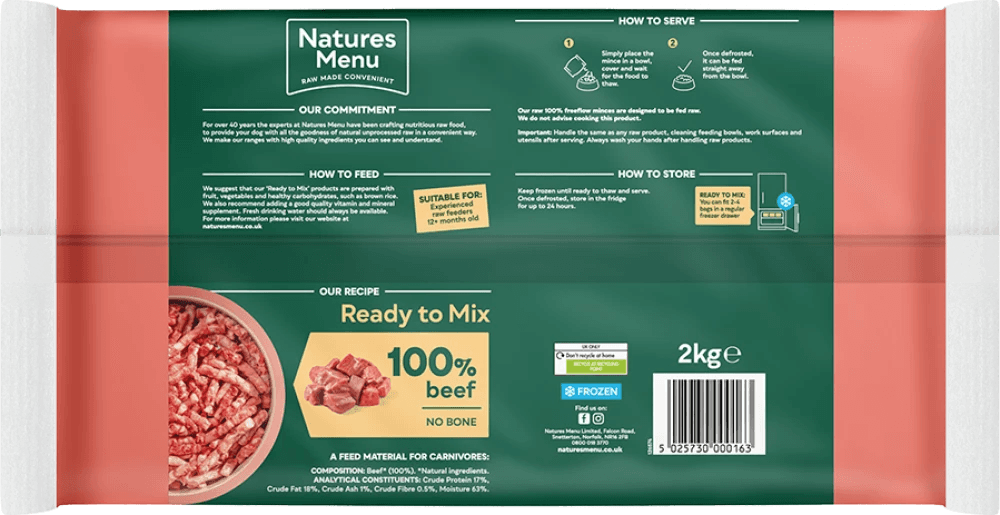 Just Beef Raw Freeflow Mince is an ingredient, not a complete meal. Add it to other ingredients to make balanced and nutritious raw meals at home.