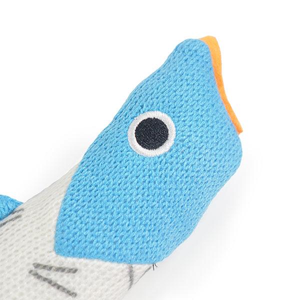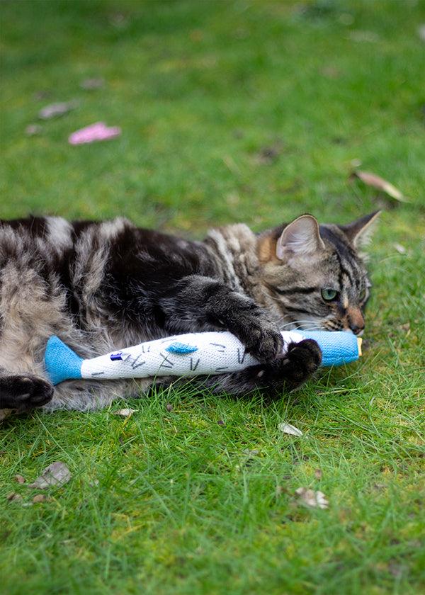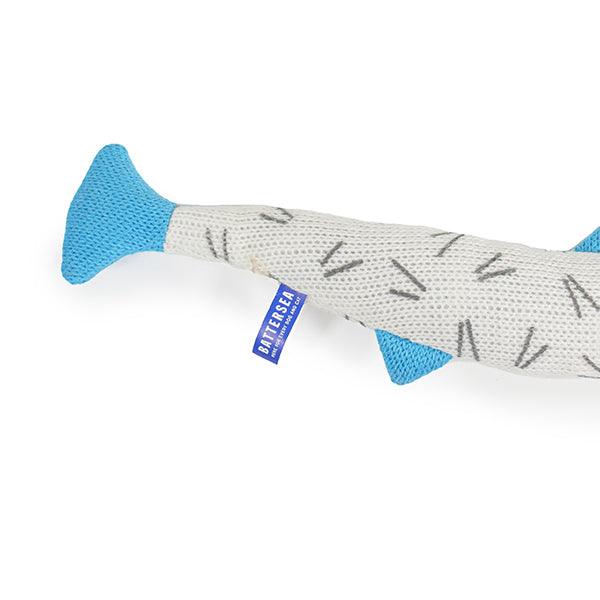 Battersea Catnip Kicker Fish with Battersea stripe and embroidery, made with high quality knitted style material perfect for clawing. Filled with catnip to encourage pouncing and playing, the fish are the perfect length for hind paw kicking at over 30cm long.