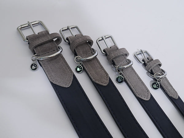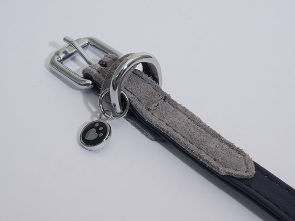 Quality luxury leather collar available in four sizes and leads in one width size. Crafted from fine leather and suedette material with robust fittings and embellished with neat details including hand stitching and decorative paw charms. Quality buckle fastening.