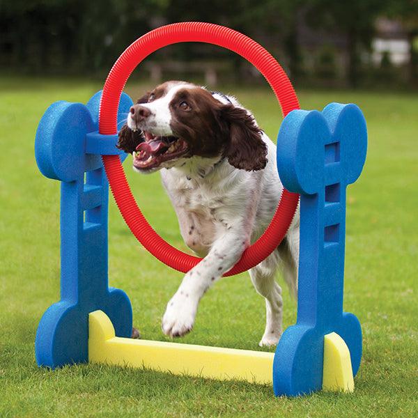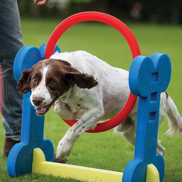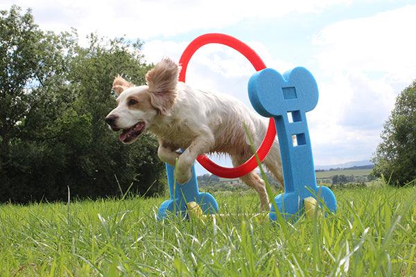 The popularity of dog agility is growing and growing, so why not create a new subcategory market opportunity with indoor and small dog agility? Our four pieces are made from a soft but rigid foam board and can be assembled in a matter of seconds. They even come in their own clear bag for carrying and storage. The height of the Hurdle and Hoop can be adjusted to suit different sizes and abilities. As you can see Holly, our cocker spaniel model, had a wail of a time and soon got the idea of things. Perfect for home, garden or park. Sized for most small to medium sized dogs... and even rabbits!