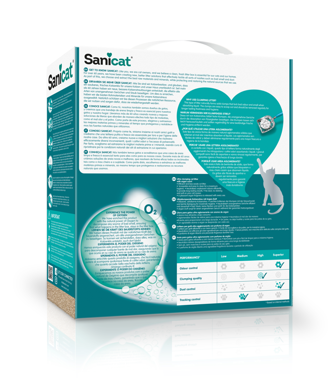 "Sanicat Active Gold: “Naturally forms sand coloured clumps that lock bad odour and smell when absorbing liquid. The clumps are easy to scoop out and should be removed regularly for longer lasting freshness and hygiene. This uses the litter more efficiently, meaning less waste of cat litter. No dust. Argan scent for ongoing freshness.”Benefits:• Enriched with the natural power of Oxygen to decompose any source of bad smell, ensuring that what happens in the litter box, stays in the litter box• Ultra clumps that are scoopable and easy to clean for maximum hygiene• Leaves no dust and stains and is soft for cat's paws• Extra odour control icon• Neutralises unpleasant odours thanks to its ultra clumping effect"