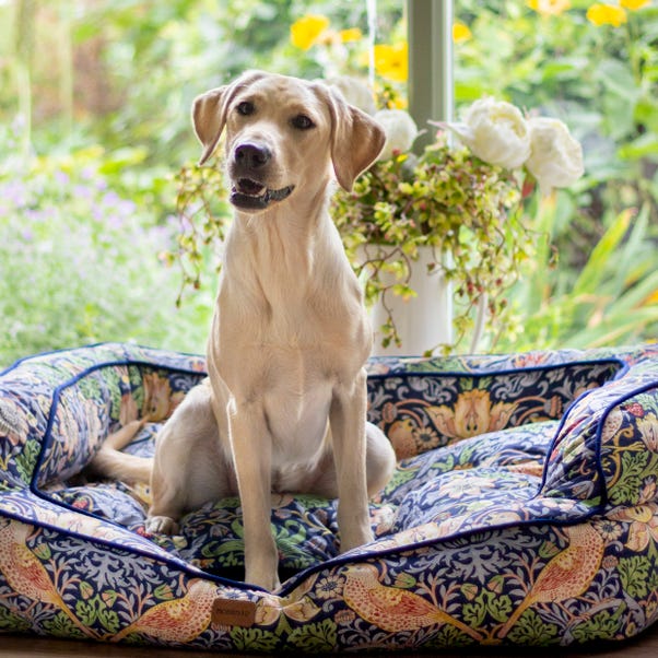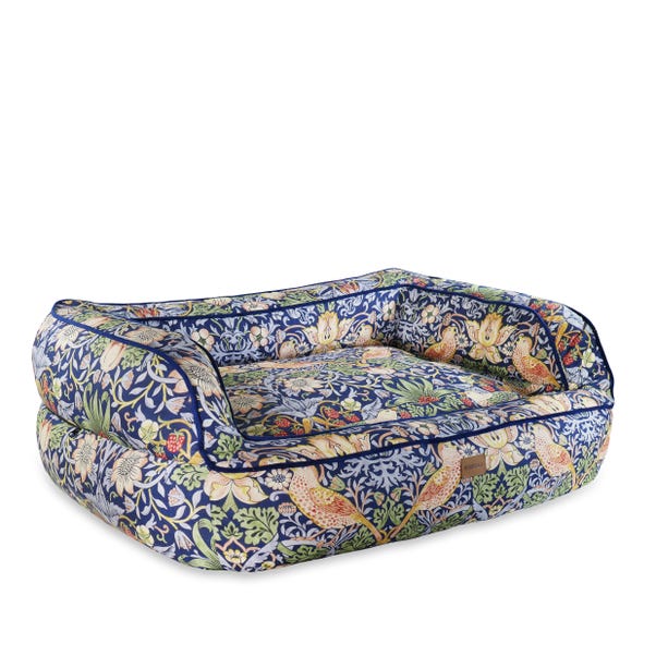 Hard-wearing cotton blend pet sofa offers ultimate comfort with high sides, memory-foam base, and a reversible cushion.