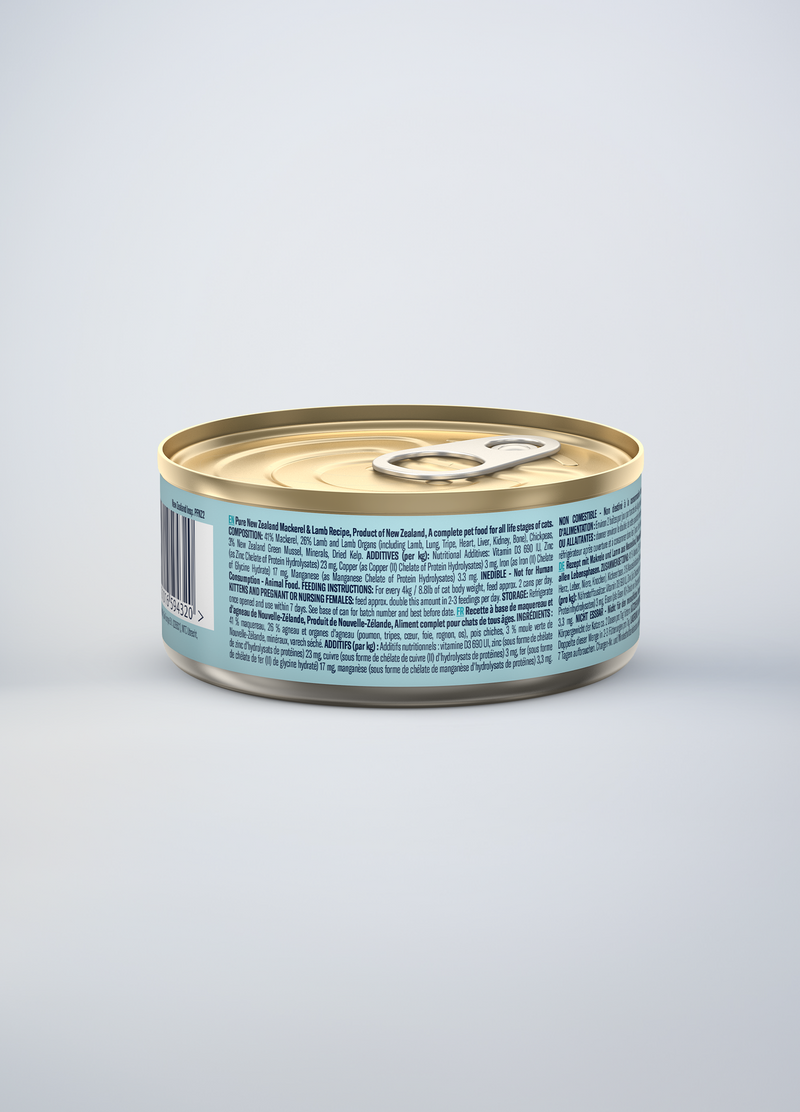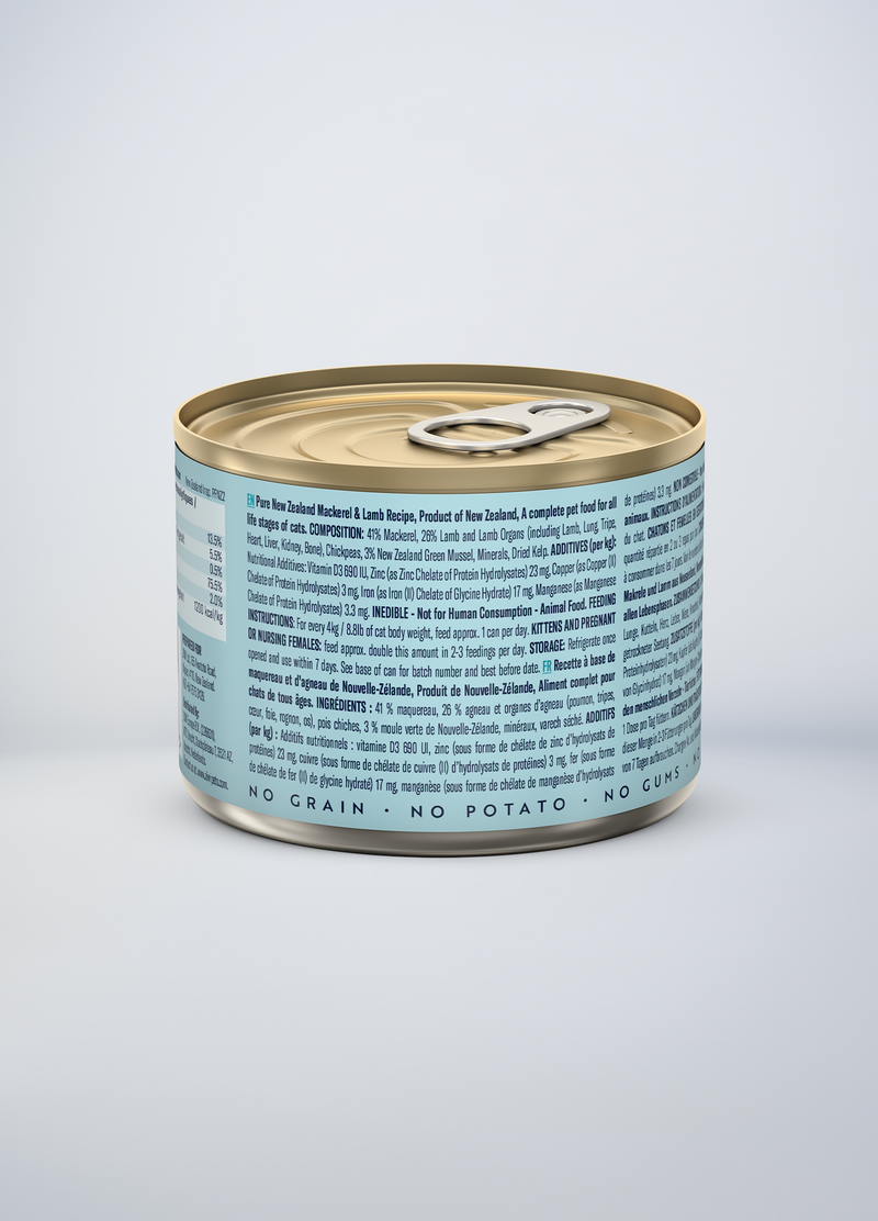 Mackerel, Water Sufficient for Processing, Lamb, Lamb Lung, Chickpeas, Lamb Tripe, Lamb Heart, Lamb Kidney, Lamb Liver, New Zealand Green Mussel, Lamb Bone, DL-Methionine, Dried Kelp, Minerals (Magnesium Sulfate, Zinc Amino Acid Complex, Manganese Amino Acid Complex, Copper Amino Acid Complex), Taurine, Vitamins (Vitamin E Supplement, Thiamine Mononitrate, Pyridoxine Hydrochloride, Vitamin D3 Supplement, Folic Acid)